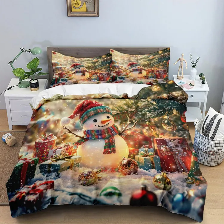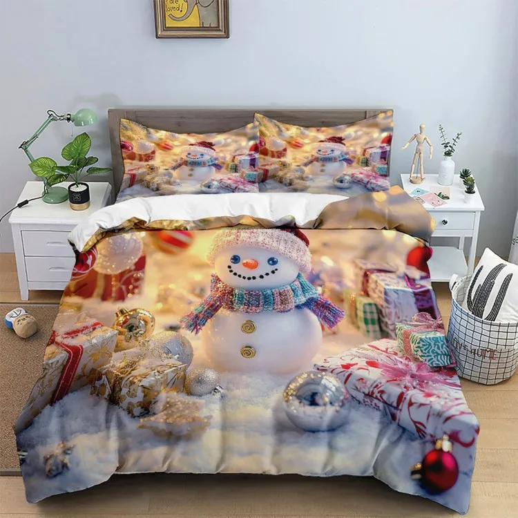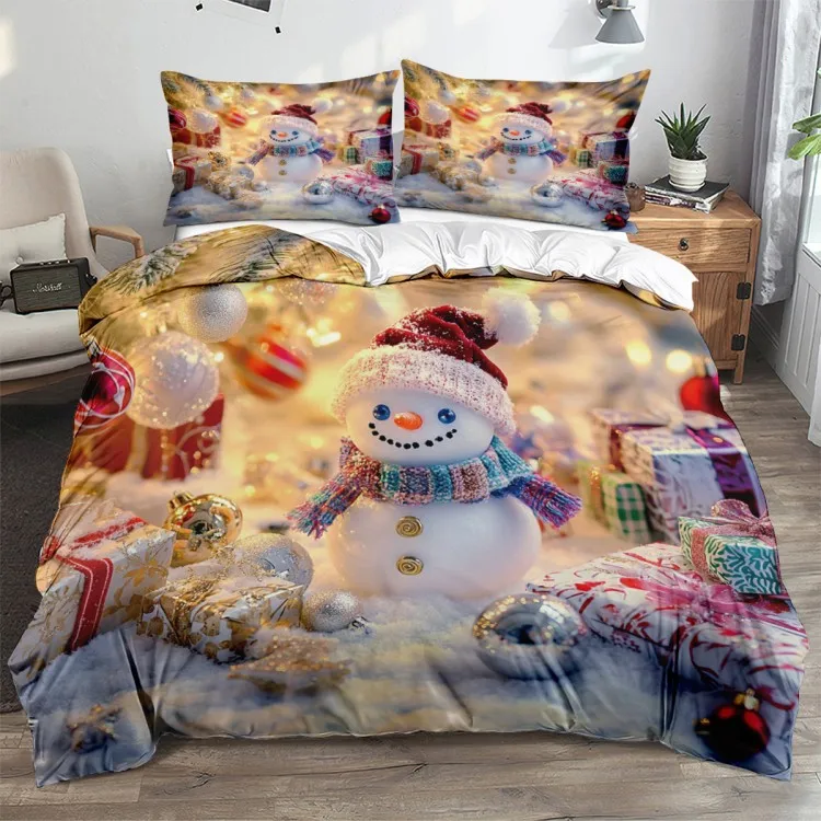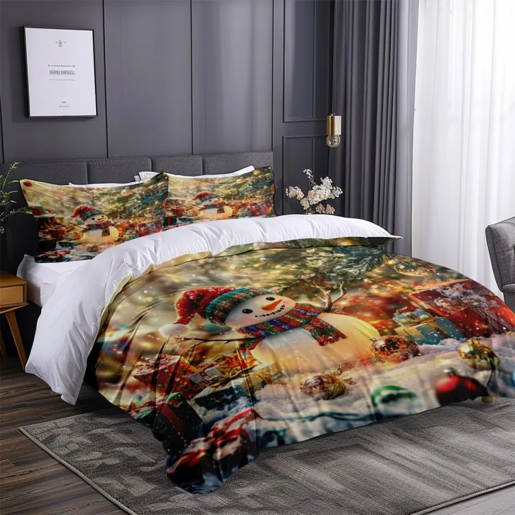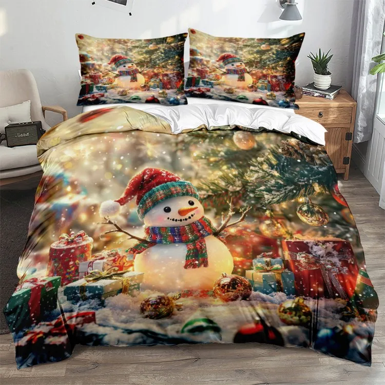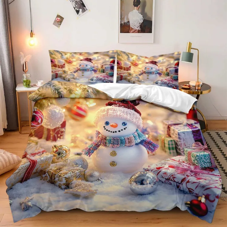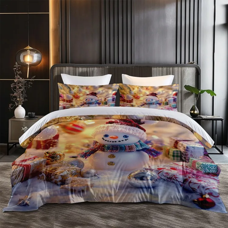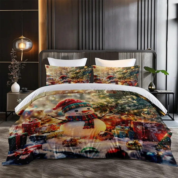 Cute snowman pattern: wearing red hat and colorful scarf. Snowman with red hat and colorful scarf, with Christmas tree, gift box and colorful balls, creating a strong festive atmosphere.